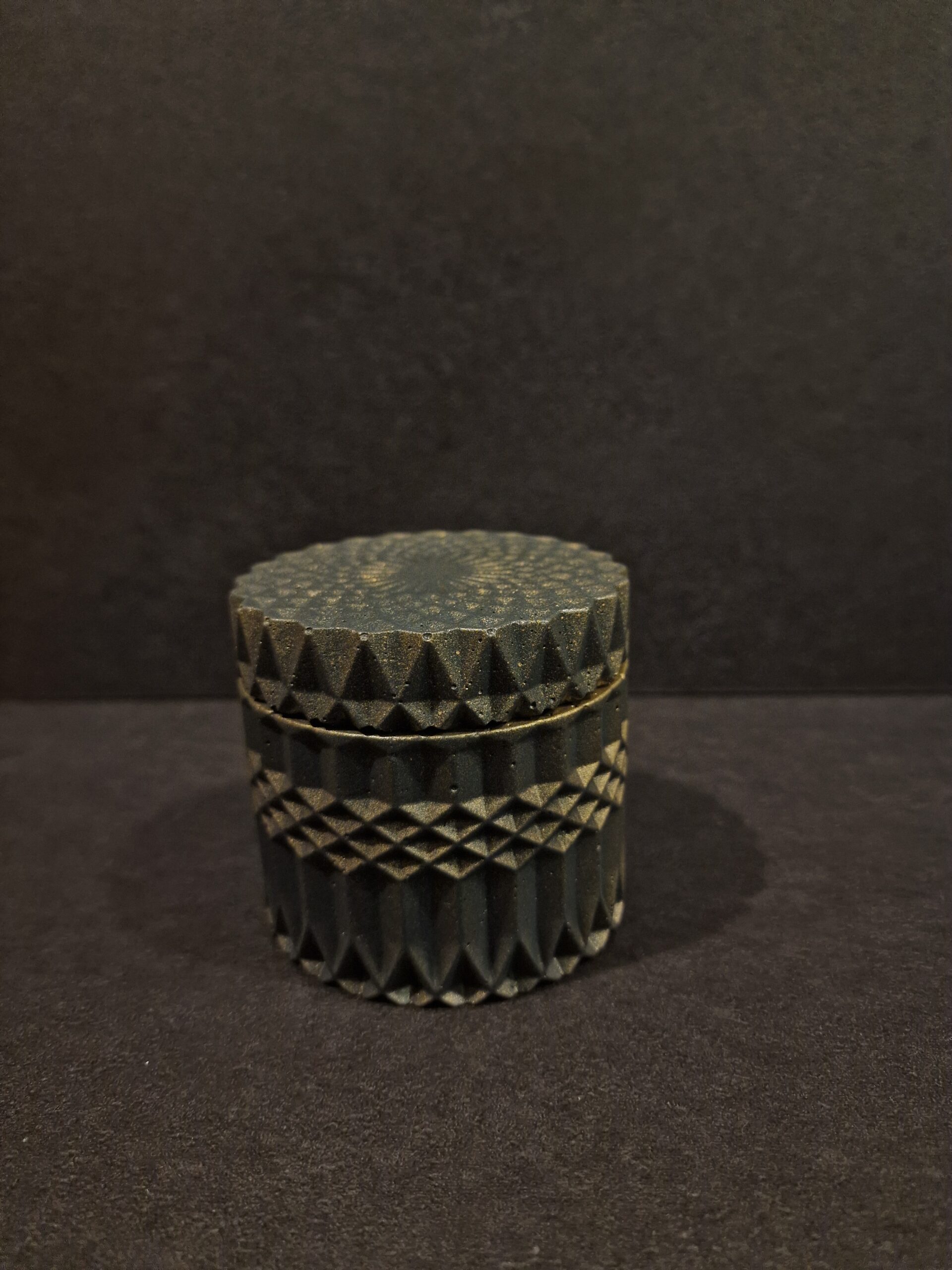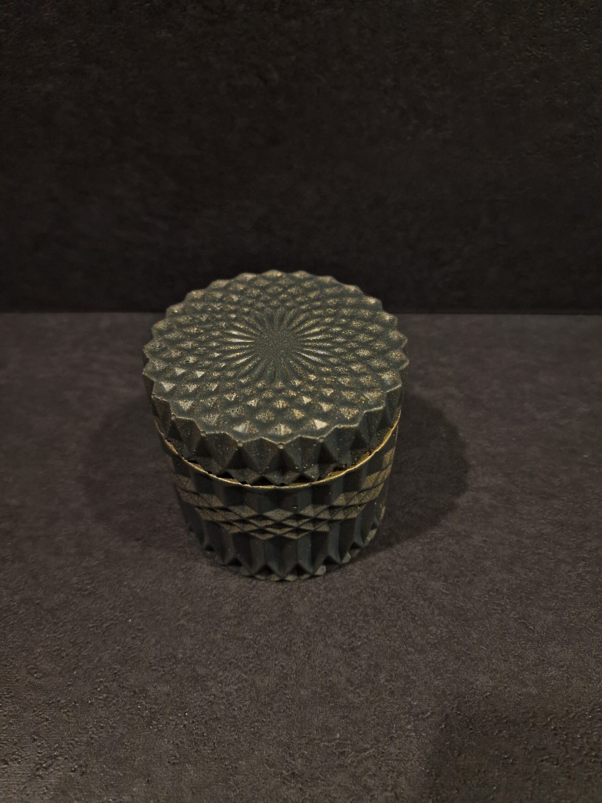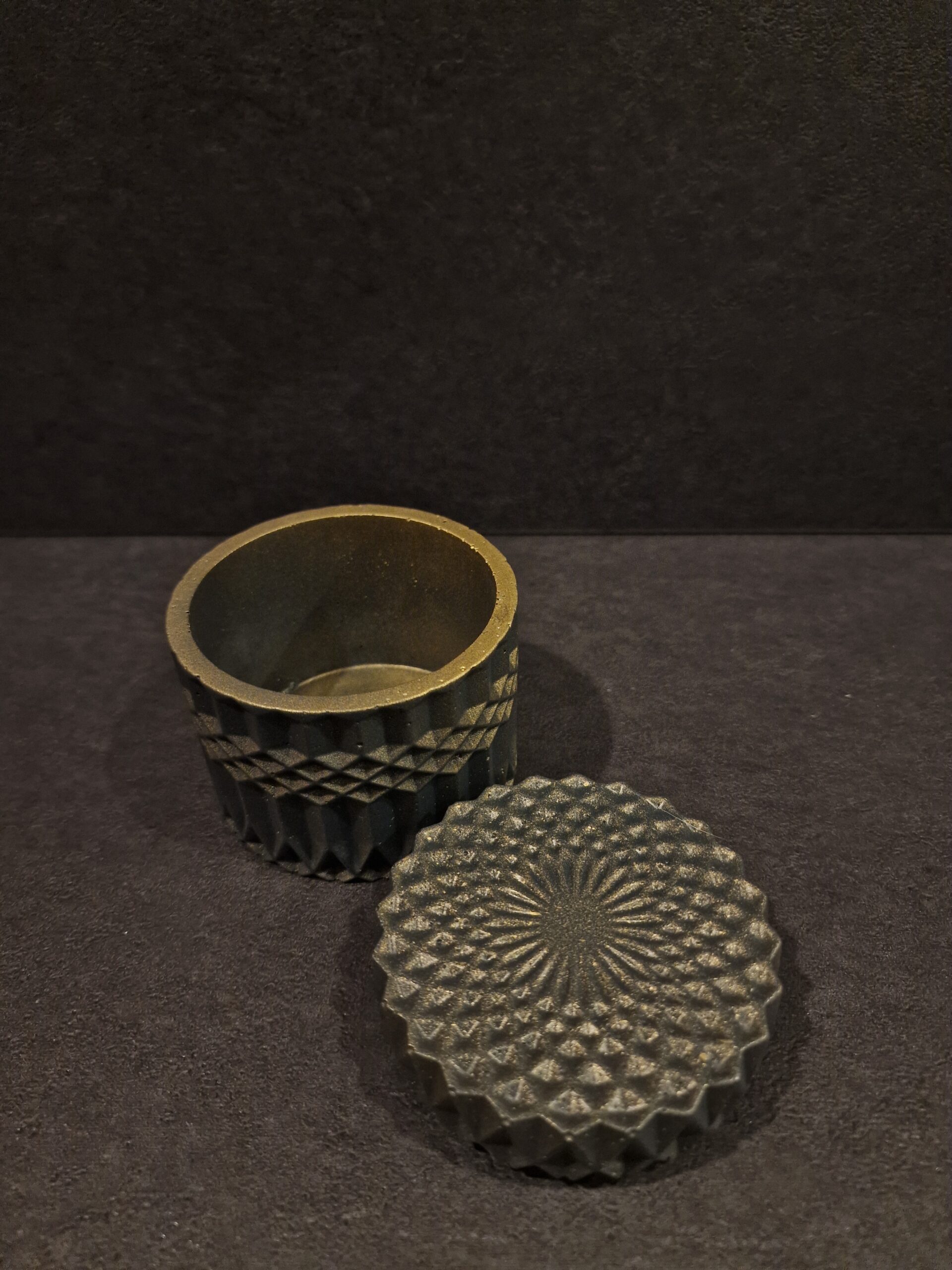 betoninis indelis, raštuota dėžutė, rankų darbo betonas, dekoratyvinis indelis su dangteliu, pilka su auksu, interjero detalė, tvarus dekoras, elegantiškas akcentas, originali dovana, modernus dekoras.