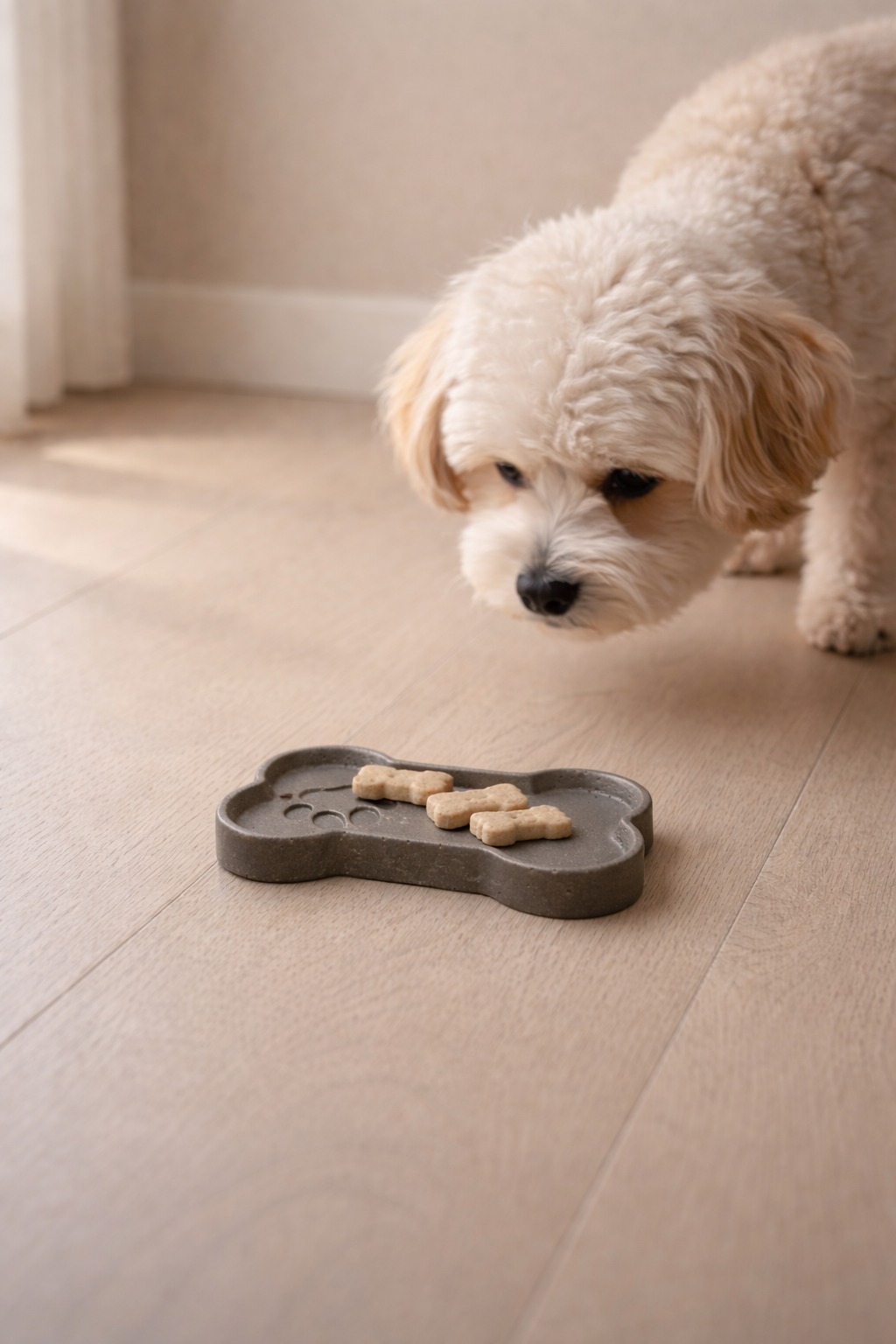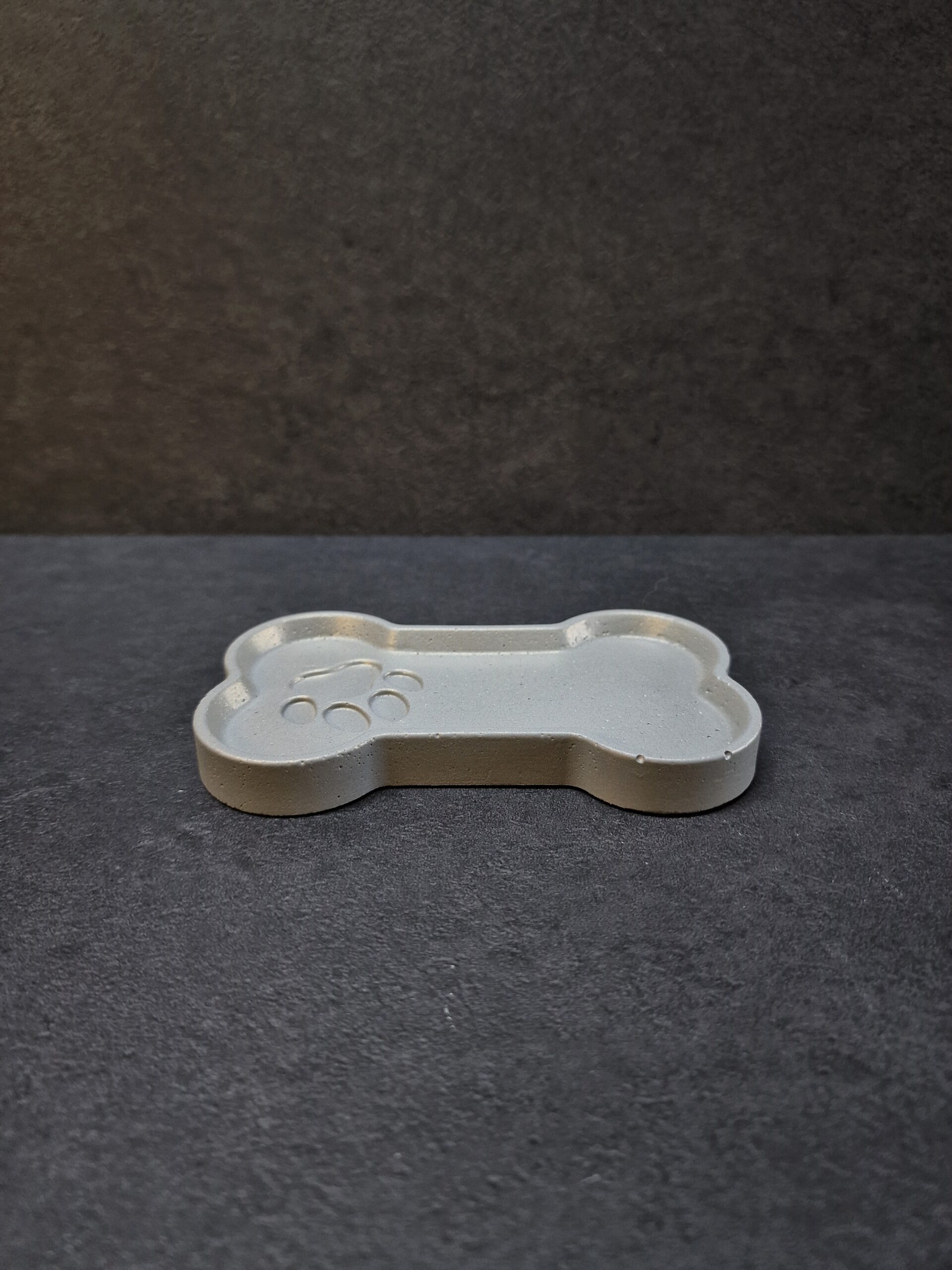 betoninis indelis, rankų darbo padėkliukas, dekoratyvinis indas, augintinio dubenėlis, kaulo formos padėkliukas, betono interjero detalė, minimalistinis aksesuaras, unikali dovana gyvūnų mylėtojui.