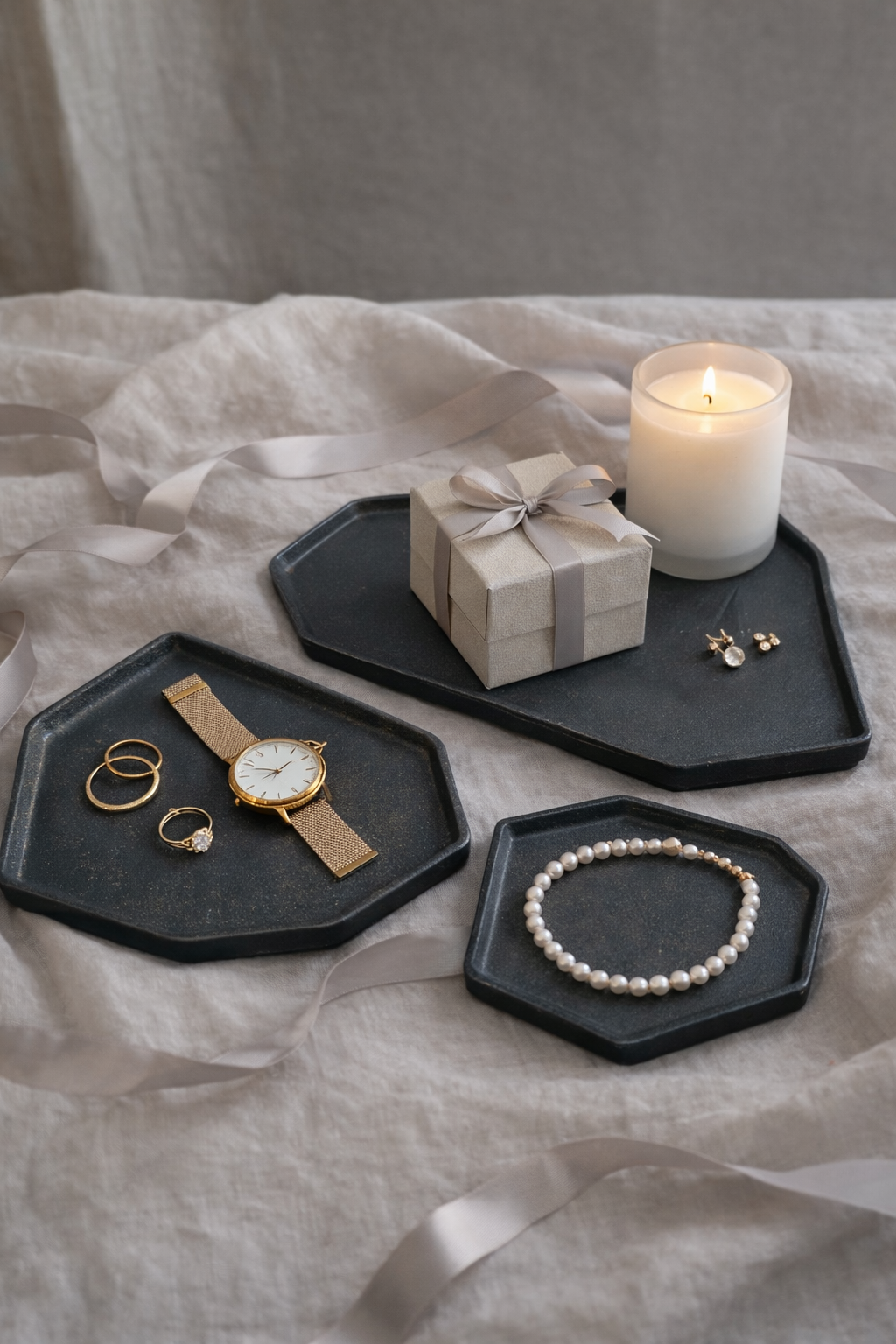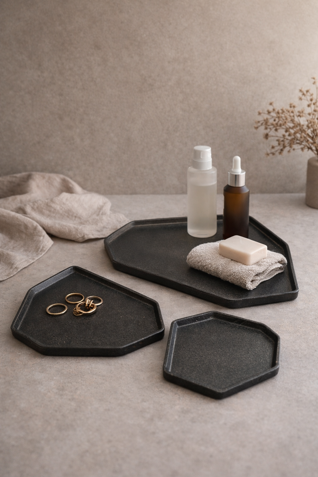 Šie rankų darbo betoniniai padėkliukai sukurti taip, kad veiktų kartu – kaip viena kompozicija. Skirtingi dydžiai leidžia išskaidyti daiktus, sukurti aiškias zonas ir išvengti vizualinio chaoso.