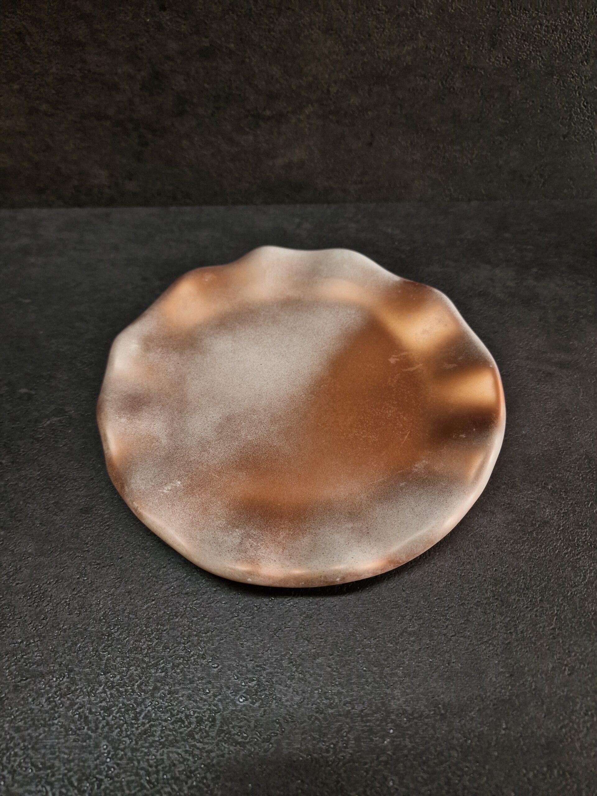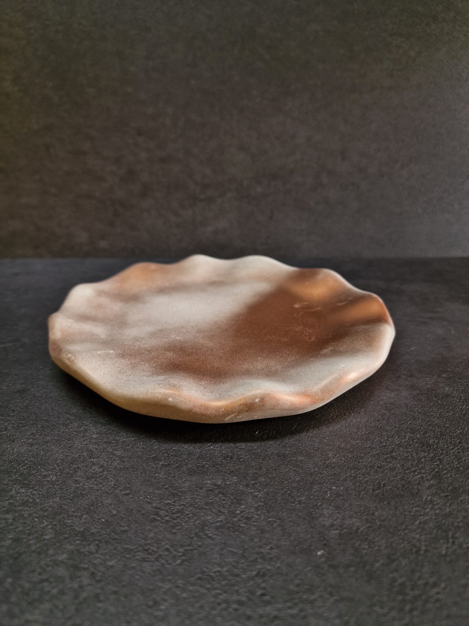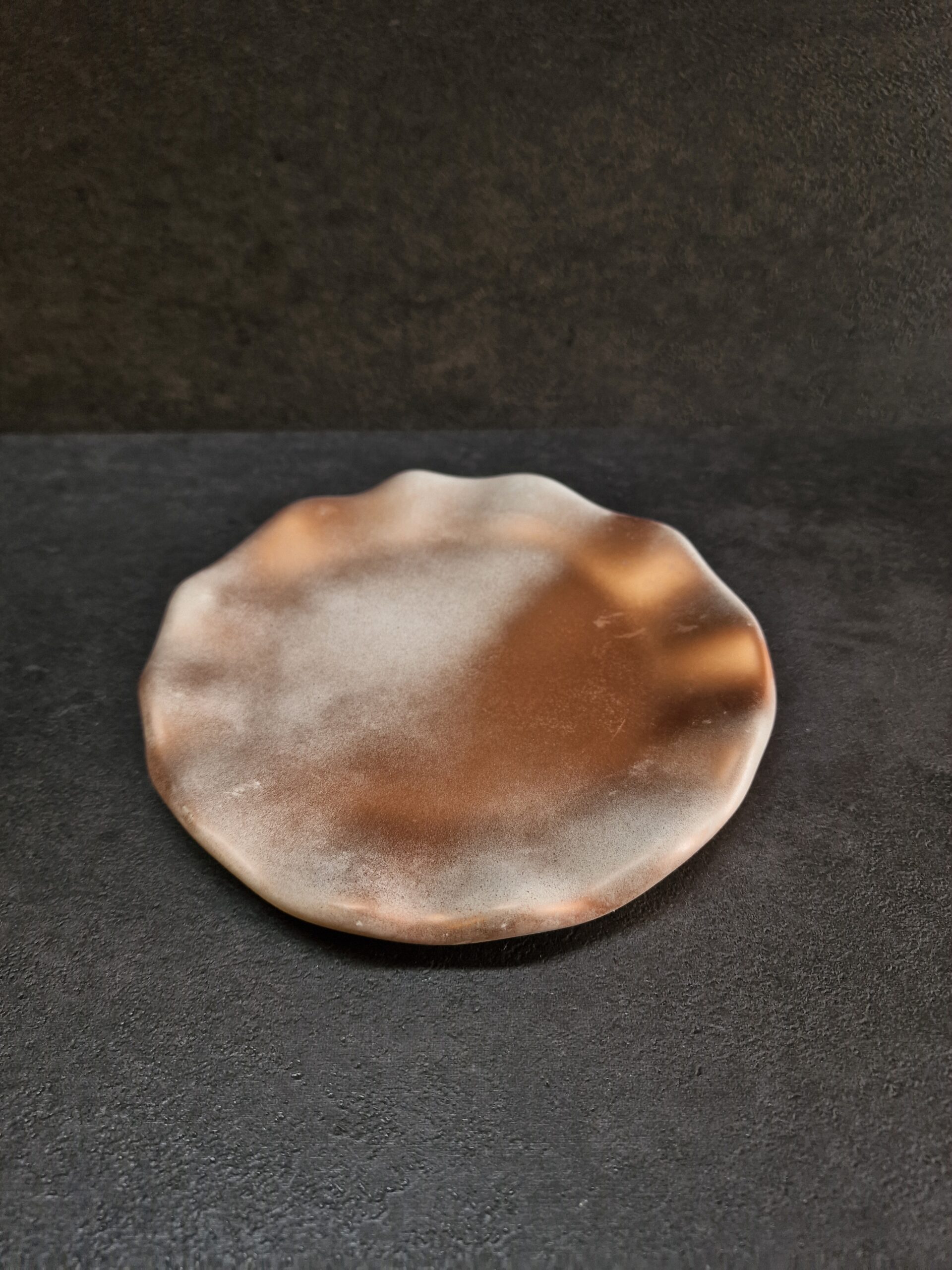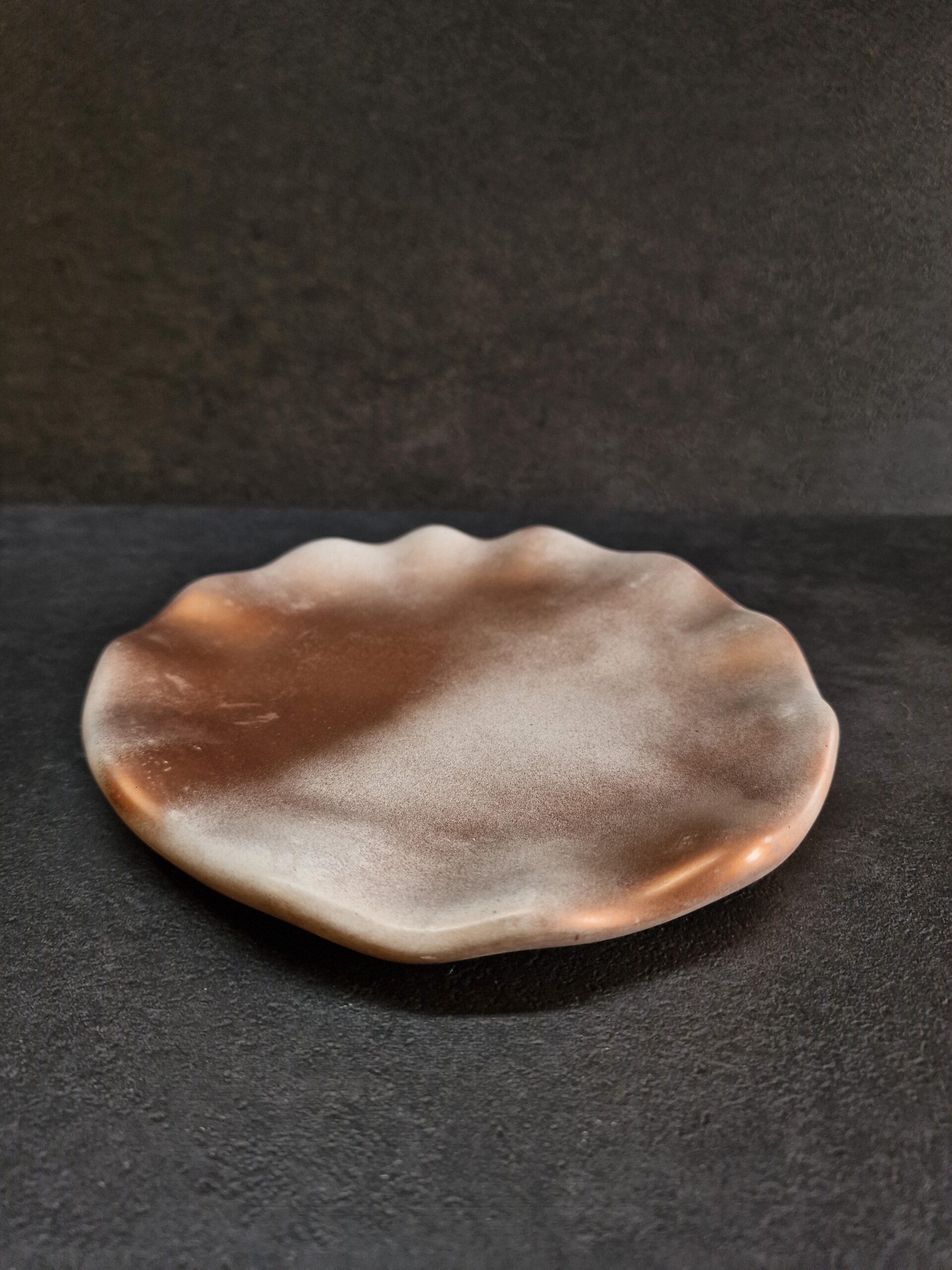 Ši betoninė rankų darbo lėkštė–padėkliukas – unikalus interjero akcentas, įkvėptas gamtos linijų ir bronzos atspalvių. Švelniai banguotas kraštas primena natūralią formą, spalvų tonai sukuria harmoningą, modernų įvaizdį.
