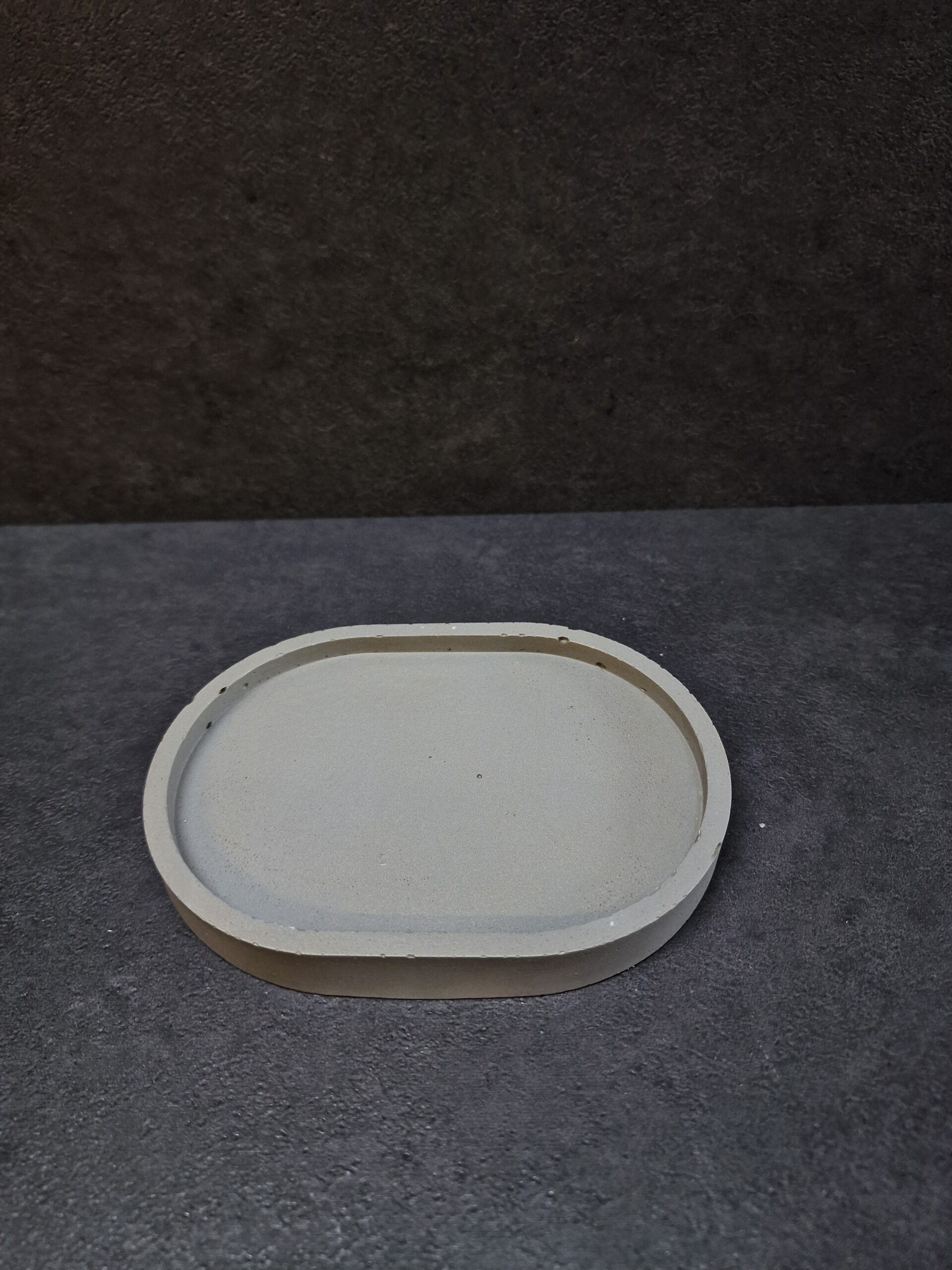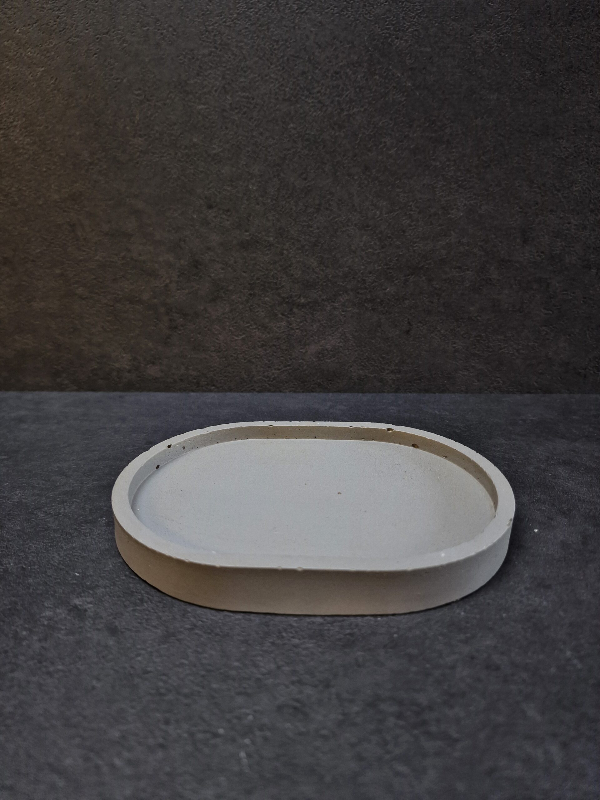 betoninis padėkliukas, rankų darbo interjero detalė, betono dekoras, muilinės padėkliukas, betoninis aksesuaras voniai, modernus interjero akcentas, pilkas padėkliukas, ovalo formos padėkliukas, minimalistinė dovana namams