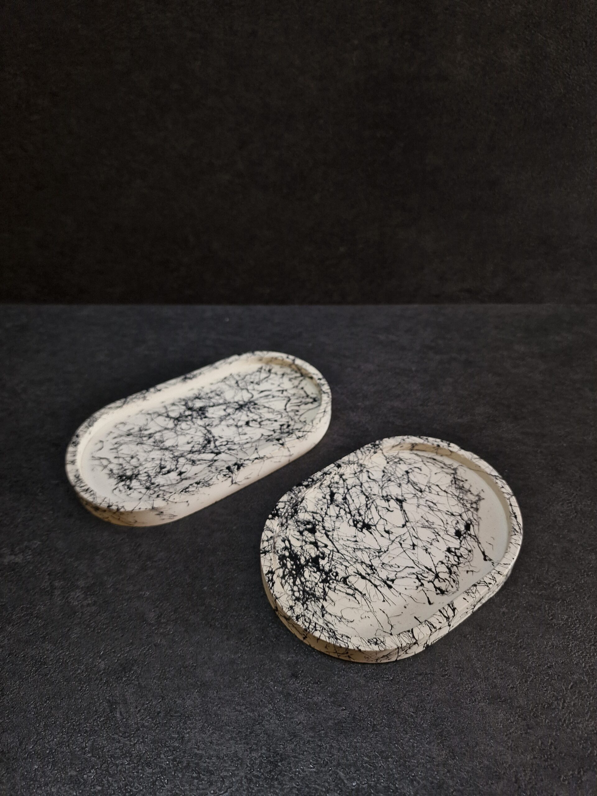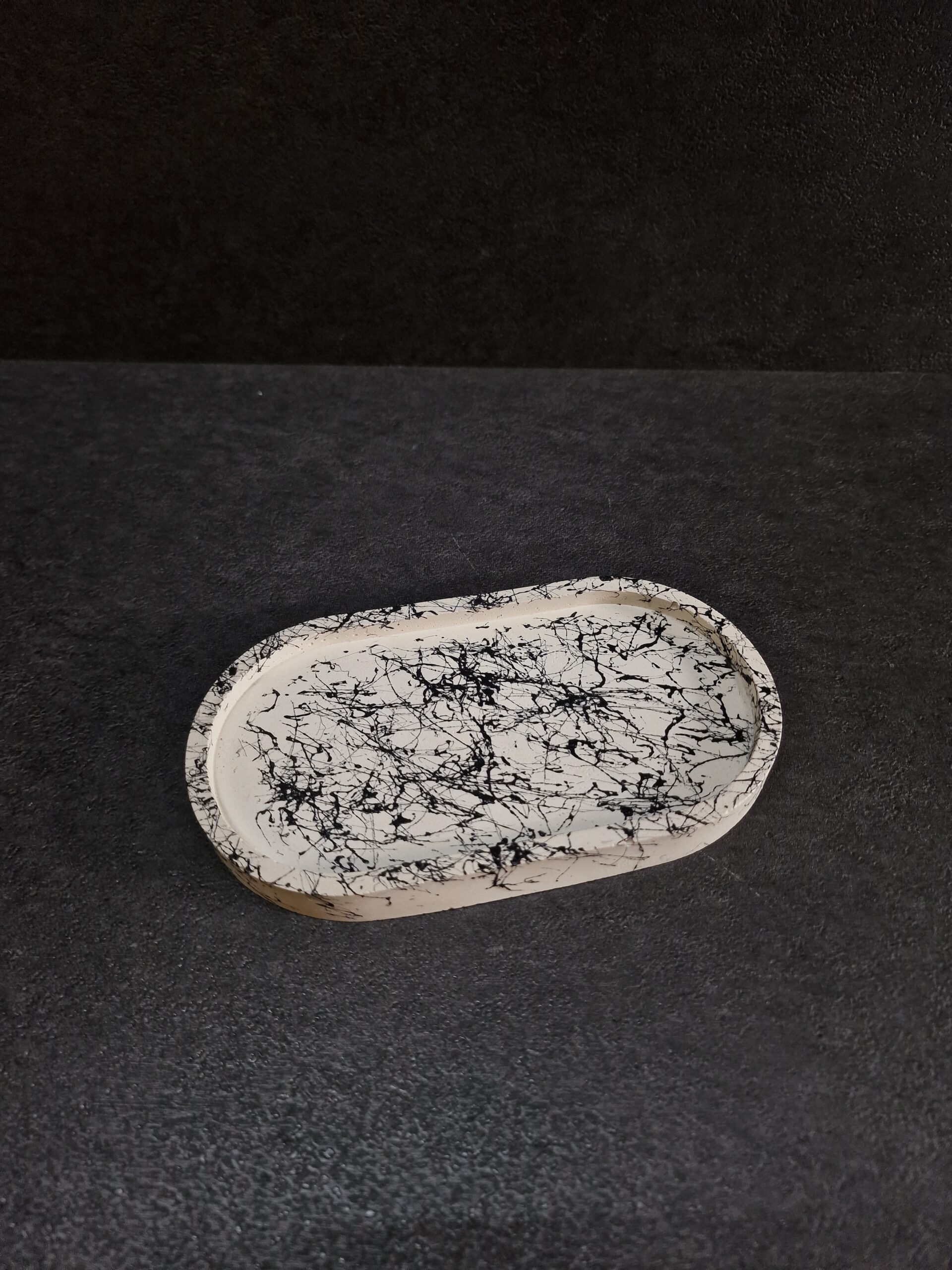 Išskirtinio dizaino rankų darbo padėkliukas, pagamintas iš betono ir dekoruotas subtiliu juodo marmuro efektu. Kiekvienas gaminys – unikalus, sukurtas kruopščiai ir su meile moderniam, minimalistiniam interjerui.