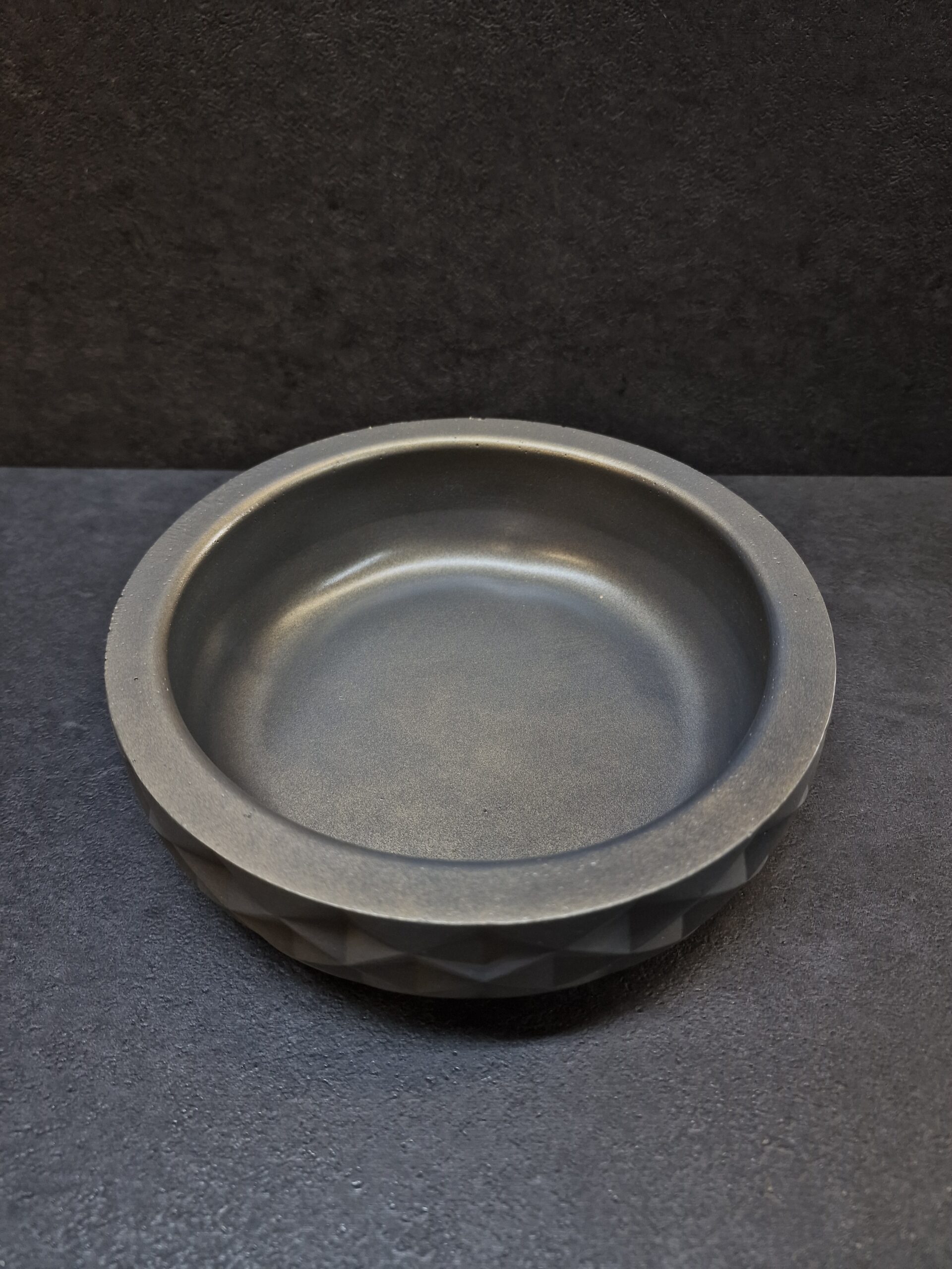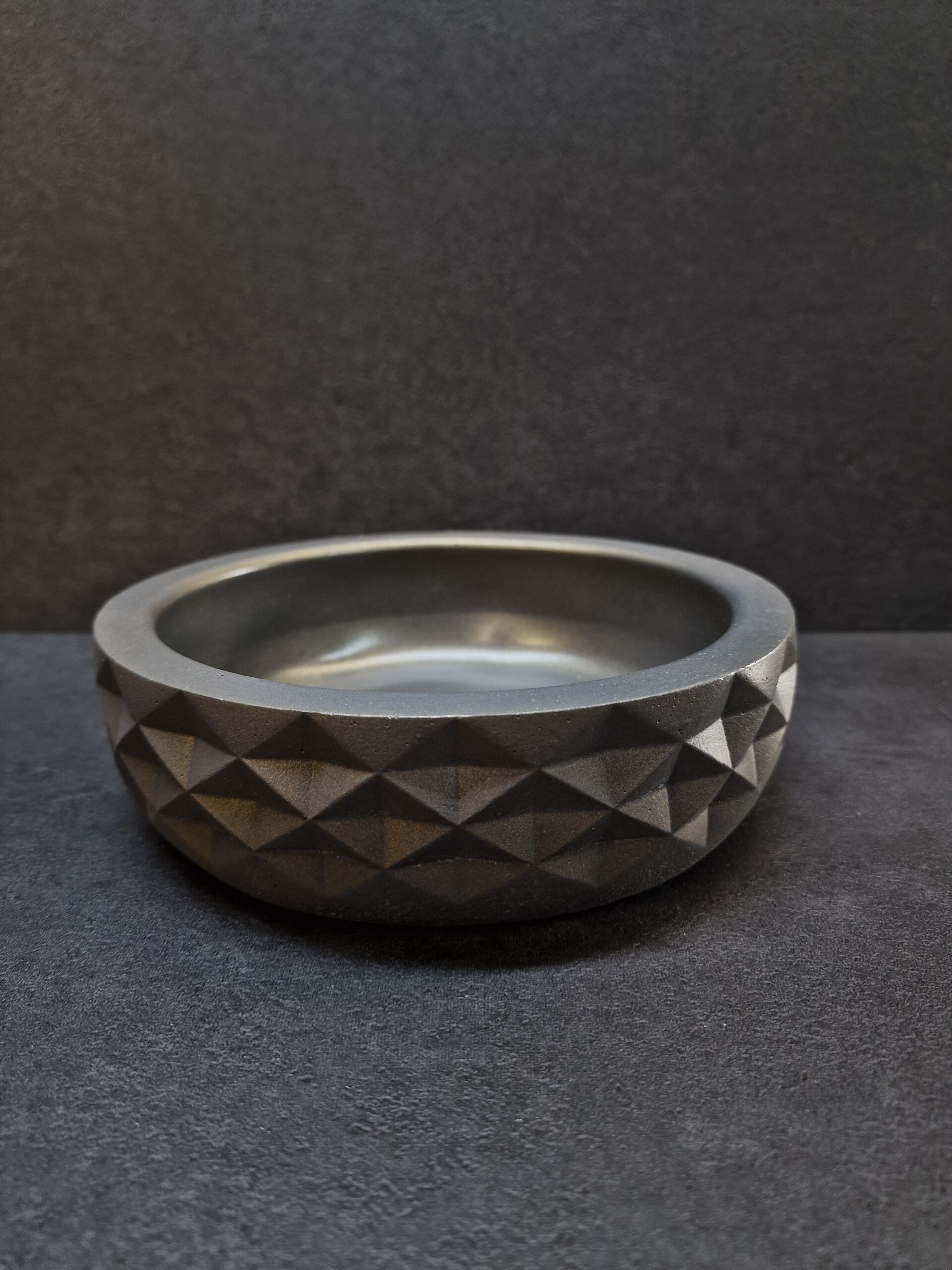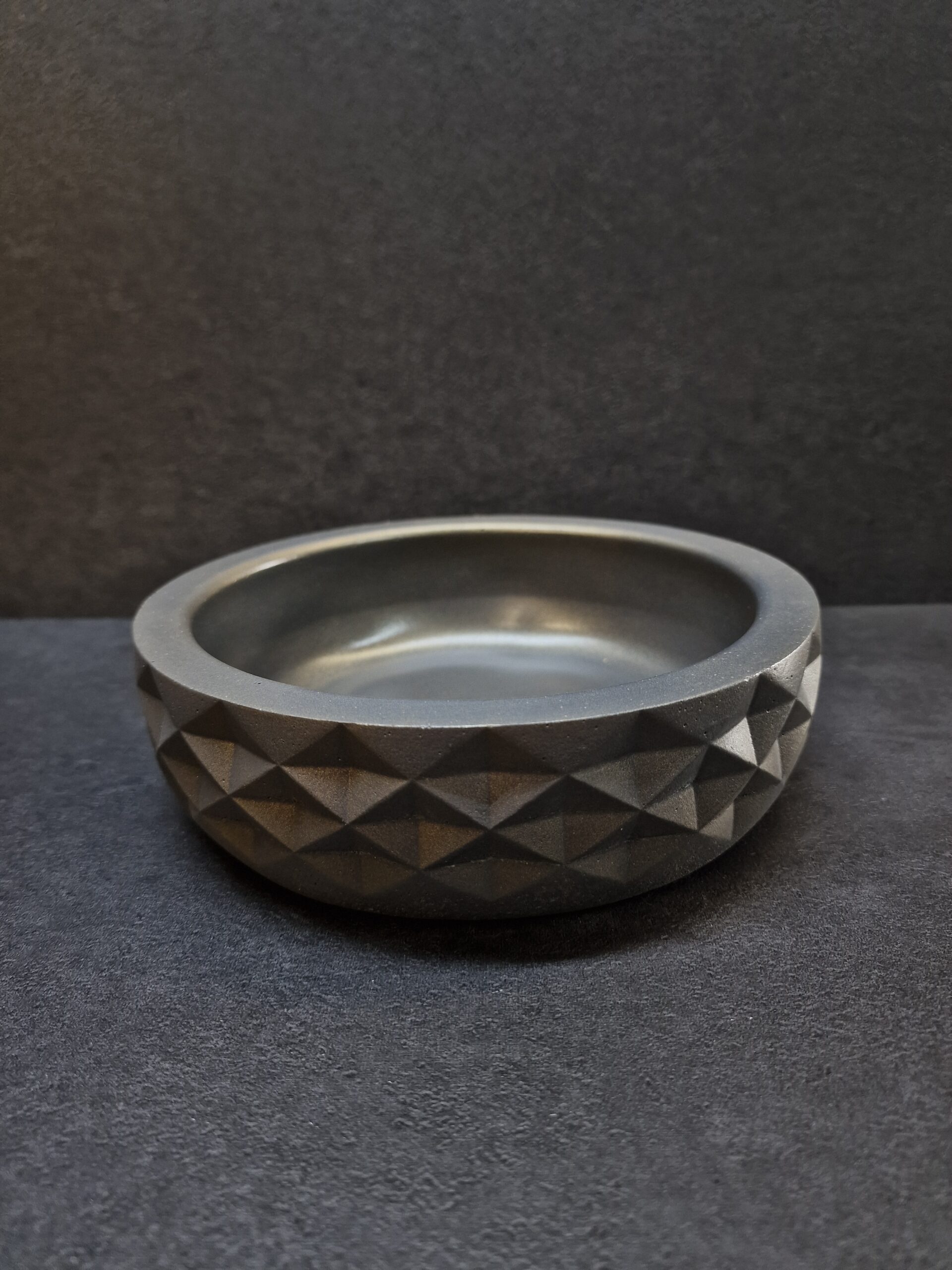 Pagamintas iš aukštos kokybės betono, šis indas pasižymi ne tik ilgaamžiškumu ir tvirtumu, bet ir unikaliu dizainu – geometrinė tekstūra suteikia jam modernumo, o subtilus tamsiai pilkas paviršius su auksiniu atspalviu kuria prabangos įspūdį.