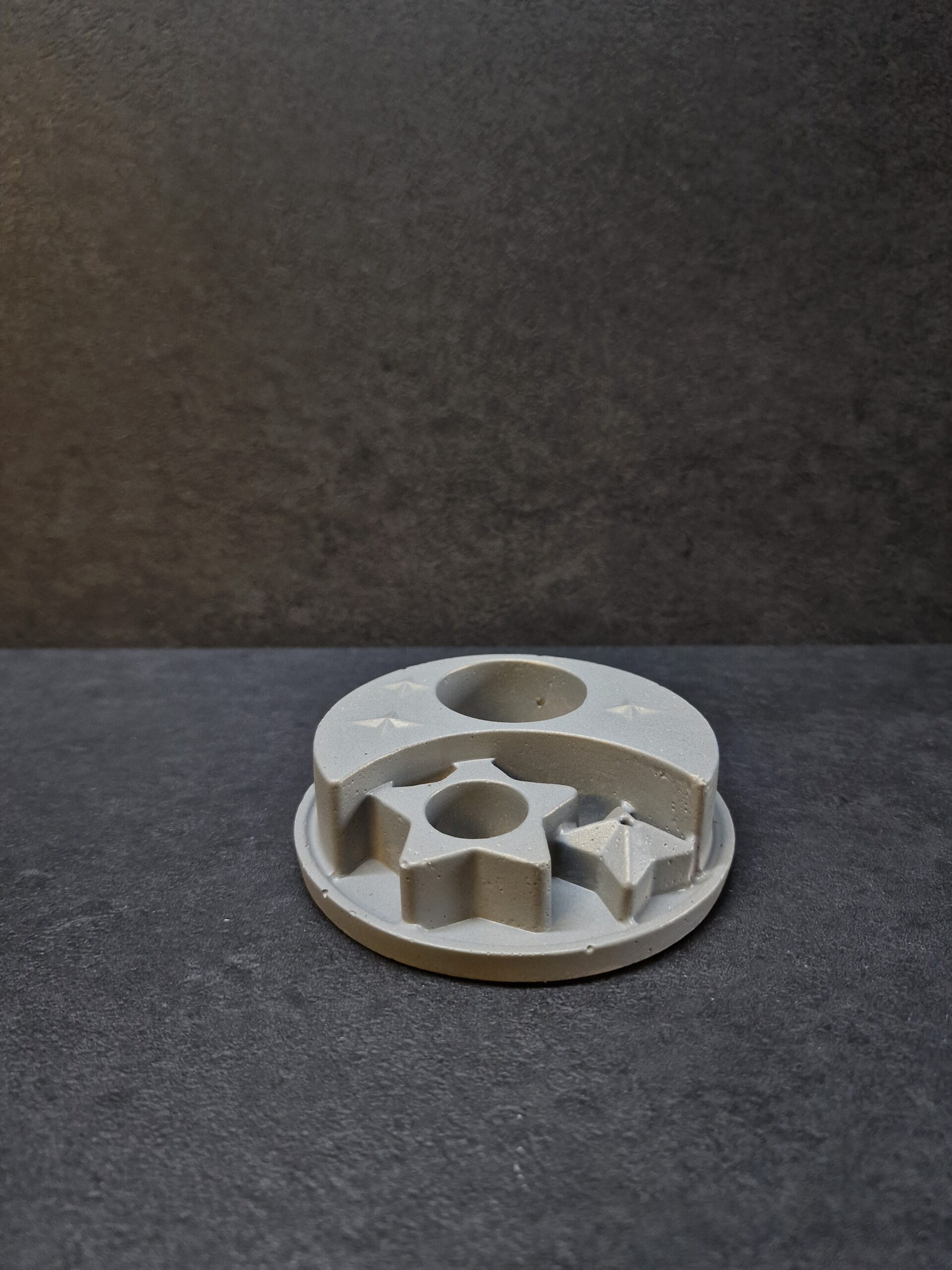 Rankų darbo betoninė žvakidė-smilkalinė Mėnulis pilka-auksas