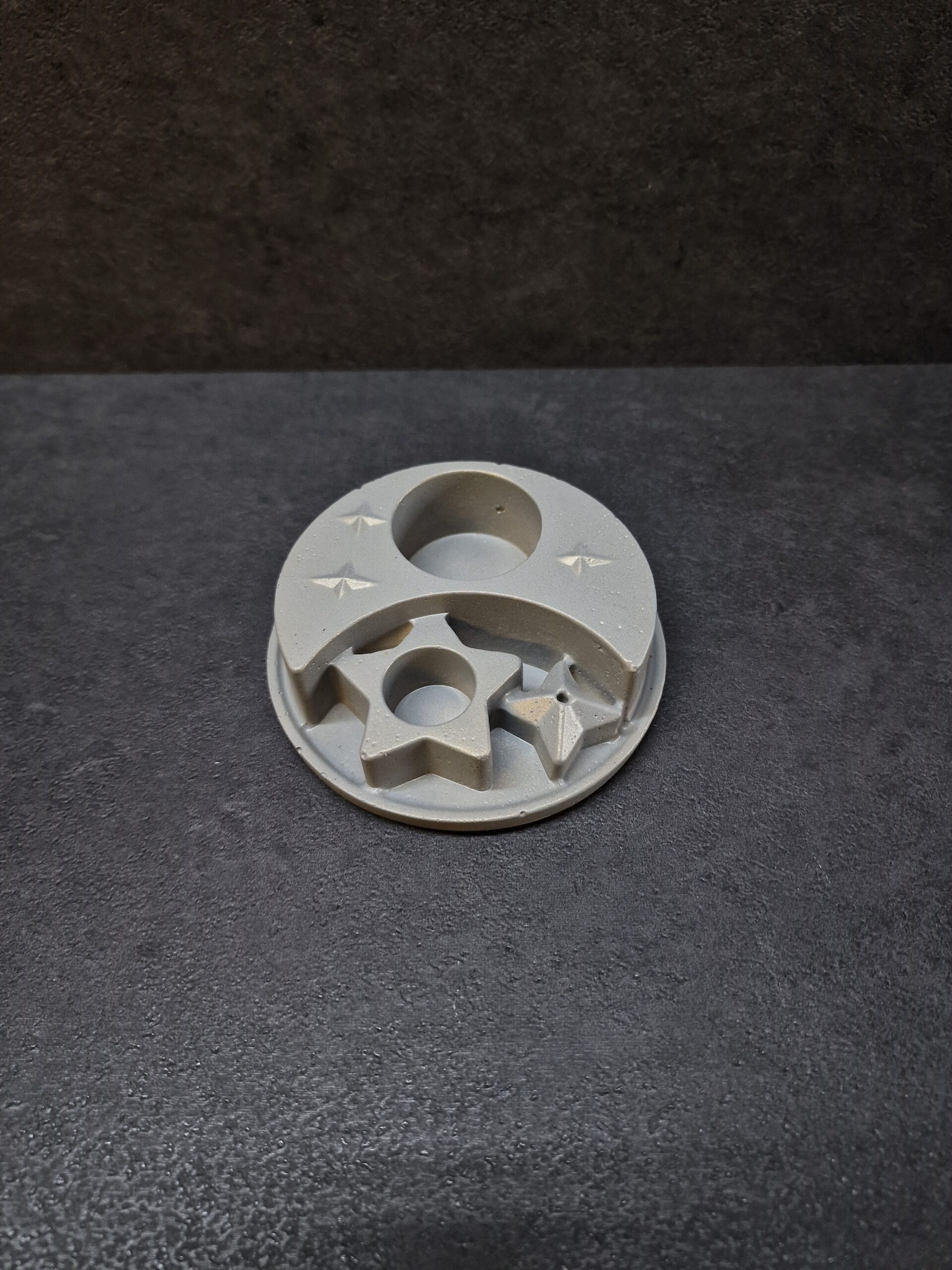 Subtilus dizainas, simbolika ir funkcionalumas susilieja šiame unikaliame interjero akcentuose – „Mėnulio magijos“ žvakidėje-smilkalinėje. Jos formose slypi kosminiai motyvai – mėnulis, žvaigždės ir mistiškos geometrinės detalės, kurios ne tik kuria ypatingą atmosferą namuose, bet ir kviečia į dvasinių ritualų bei kasdienių ramybės akimirkų pasaulį.