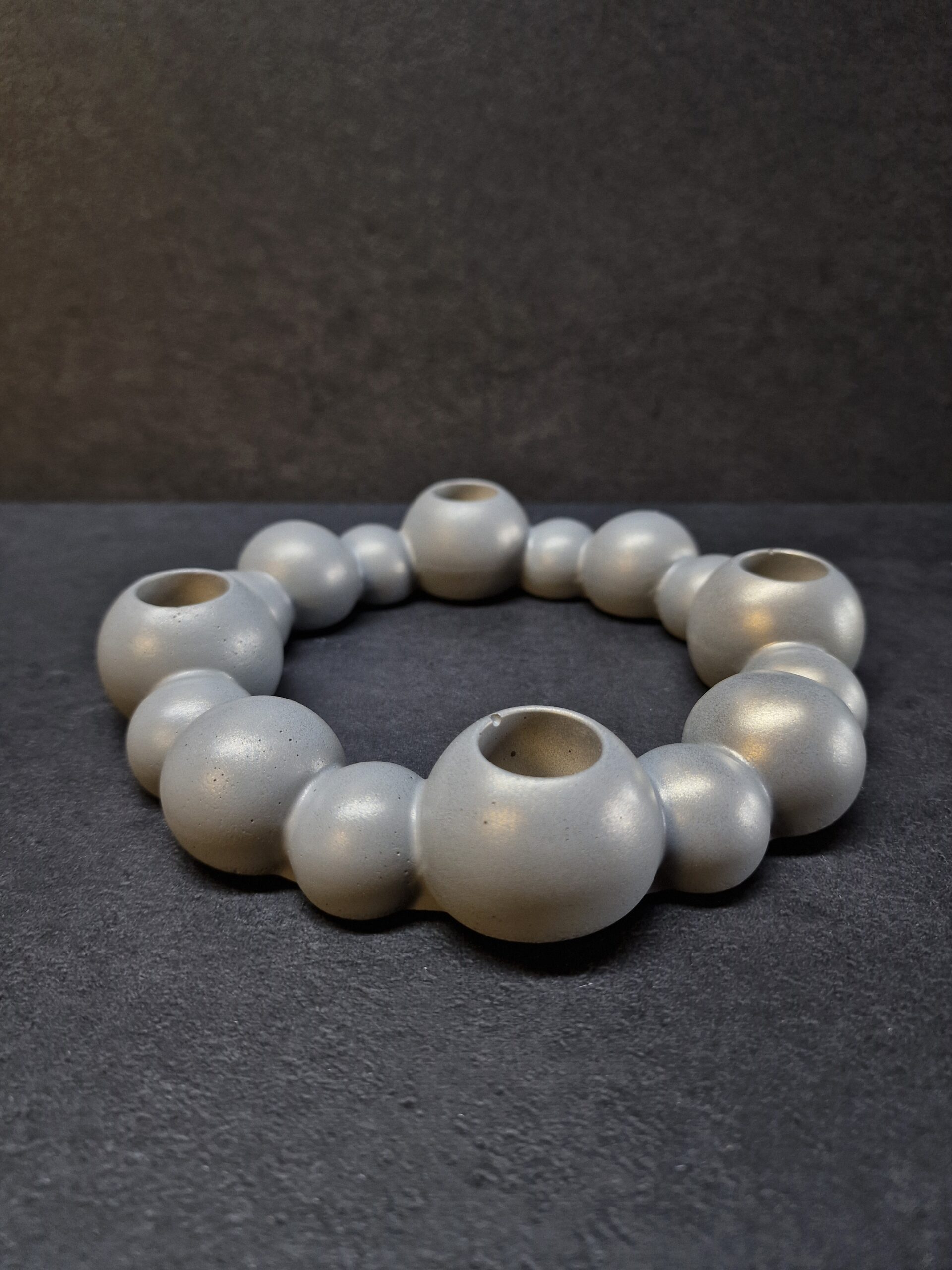 betoninė žvakidė, rankų darbo žvakidė, modernus interjero akcentas, unikali stalo dekoracija, vainiko formos žvakidė, betoninė namų dekoracija, minimalistinė žvakidė